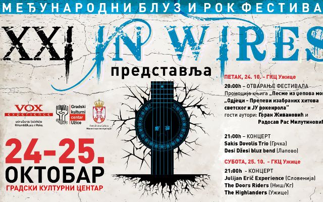 U Gradskom kulturnom centru večeras počinje 21. Međunarodni blues & rock festival In Wires. Tokom dva dana vikenda (petak i subota) publika će moći da uživa u različitim programskim sadržajima, kao što su promocije knjiga, i da prisustvuje koncertima domaćih i inostranih muzičkih izvođača.