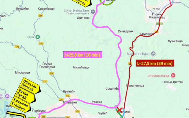 Za korisnike koji iz pravca Beograda putuju ka Čačku i Kraljevu, preporučena putanja će biti: