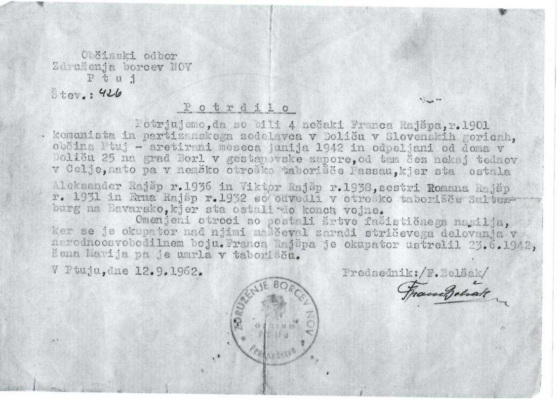 U originalnoj potvrdi Opštinskog odbora Udruženja boraca NOR-a Ptuj navodi se da su četvoro nećaka Franca Rajšpa (1901), komuniste i partizanskog aktiviste, odvedeni u dečji logor Saldenburg: Aleksandar (1936), Viktor (1938), Romana (1931) i Erna (1932). Odvođenju dece prethodio je pretres kuće Rajšpovih u Doliču u junu 1942. godine, kada su esesovci tražili oružje i nisu ga pronašli. To ih nije sprečilo da Franca deportuju u logor Pasau, jedan od logora fabrike smrti Mauthauzen, gde je ubijen 23. juna 1942. godine, dok je njegova supruga Marija, teta „Mici“, ubrzo nakon toga uhapšena i umrla u logoru.