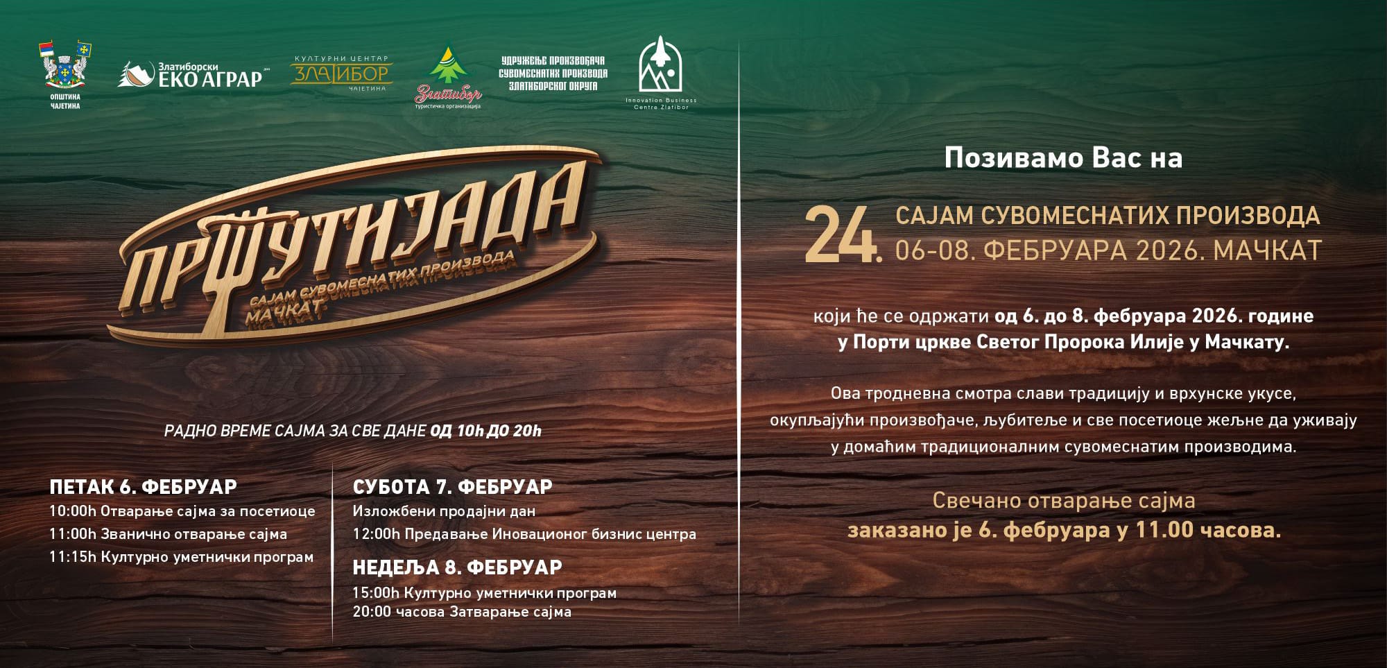 Opština Čajetina, u saradnji sa javnim preduzećima i partnerima koji su dali svoj doprinos organizaciji, sa ponosom najavljuje održavanje 24. Pršutijade, tradicionalne manifestacije koja će se ove godine održati od 6. do 8. februara u porti crkve Svetog proroka Ilije u Mačkatu.