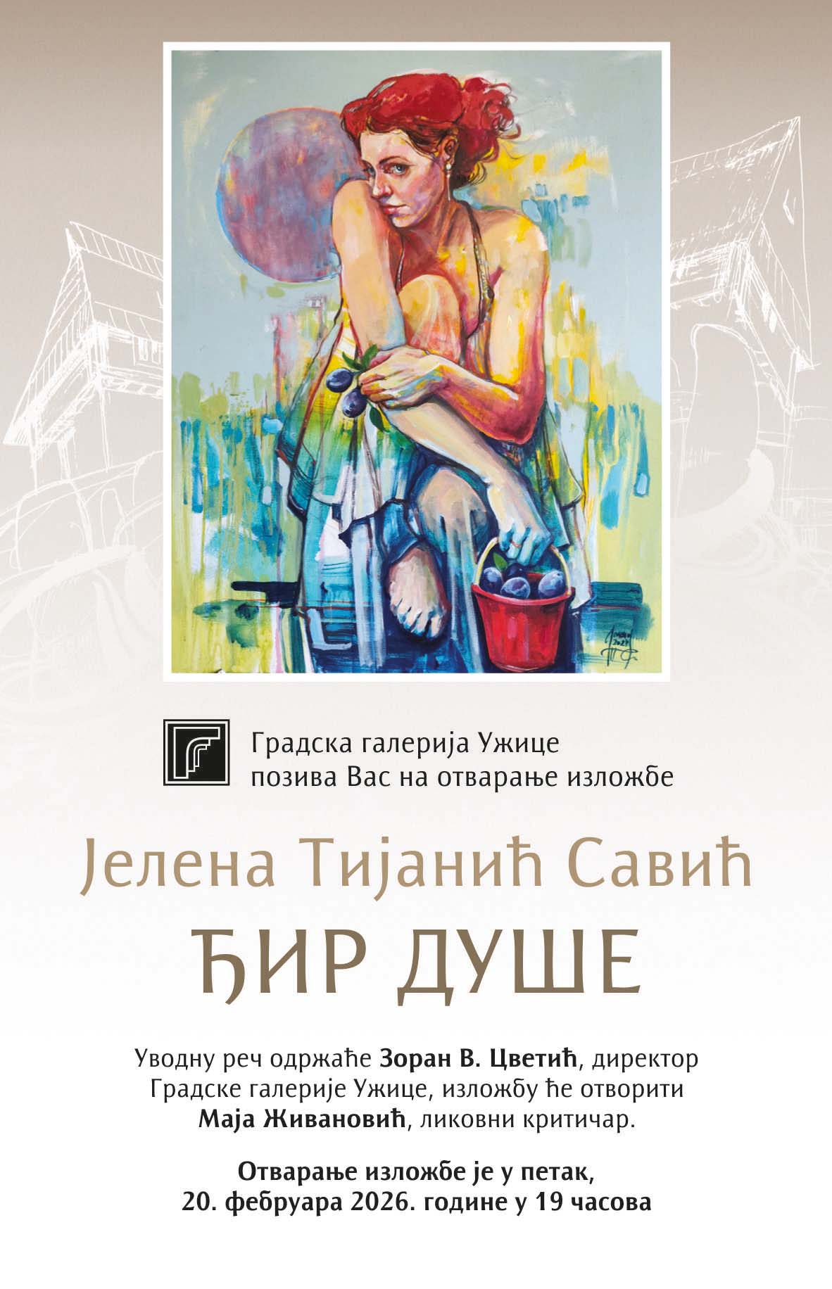 Gradska galerija Užice najavila je otvaranje izložbe „ĐIR DUŠE” umetnice Jelena Tijanić Savić, koje će biti održano u petak, 20. februara 2026. godine, sa početkom u 19 časova.