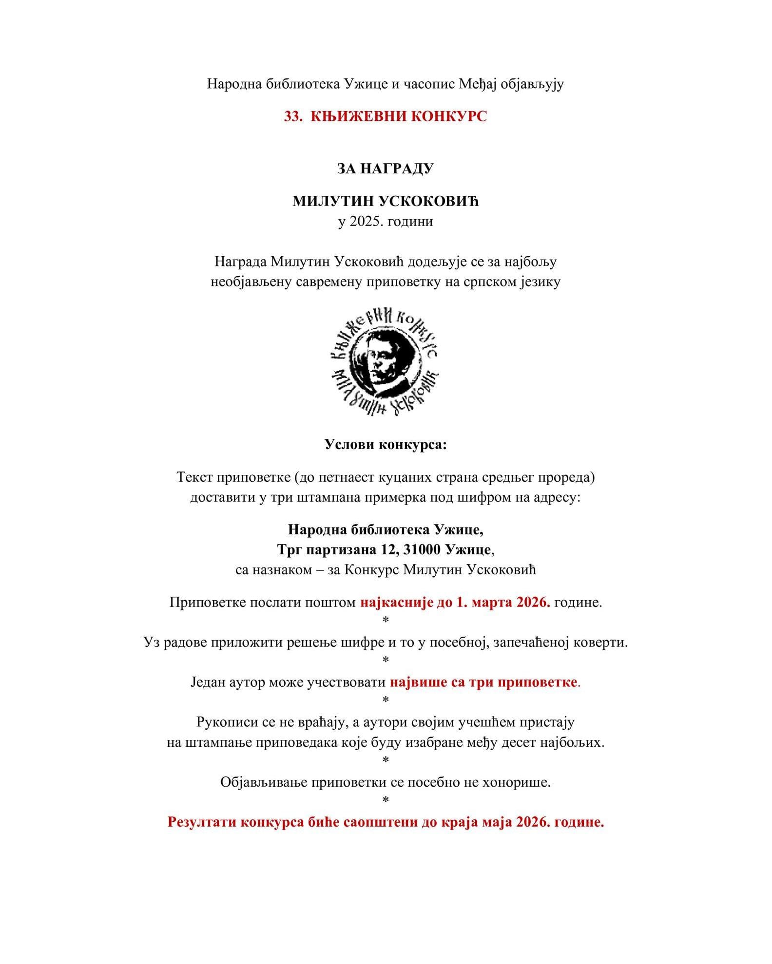 Narodna biblioteka Užice raspisala je 33. književni konkurs za nagradu „Milutin Uskoković“, a rok za slanje pripovetki otvoren je do 1. marta 2026. godine.