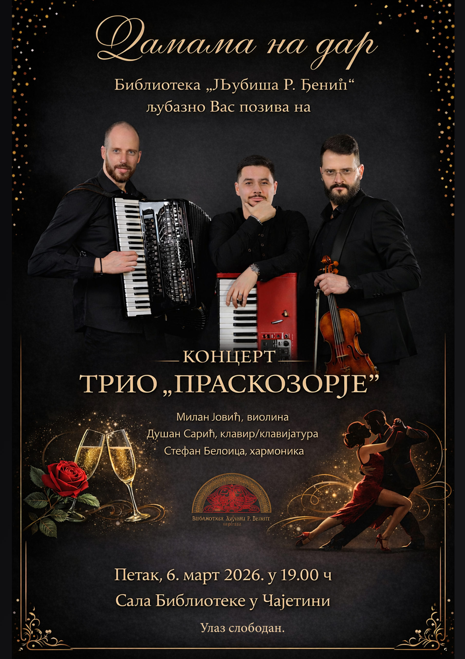 U susret 8. martu, Biblioteka „Ljubiša R. Đenić“ iz Čajetine organizuje koncert „Damama na dar“ u petak, 6. marta, u 19 časova u sali Biblioteke u Čajetini.