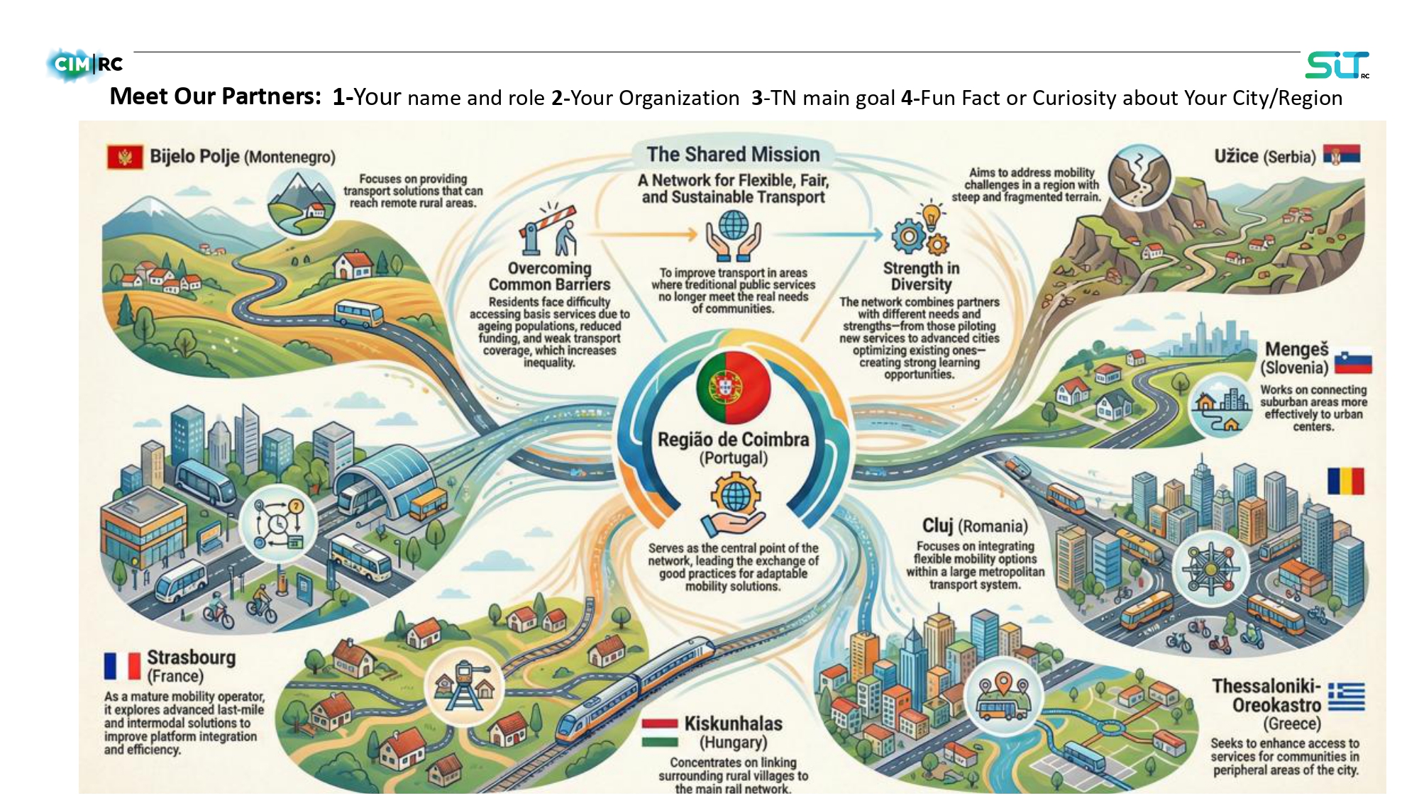 Mrežu predvodi međuopštinska zajednica regiona Koimbre iz Portugala, koja je razvila uspešan model prevoza na zahtev i čija se dobra praksa prenosi na partnerske gradove. Pored Užica, u projektu učestvuju Strazbur (Francuska), Kluž (Rumunija), Solun (Grčka), Kiškunhalaš (Mađarska), Mengeš (Slovenija) i Bijelo Polje (Crna Gora). Projekat se realizuje u periodu od novembra 2025. do aprila 2028. godine.