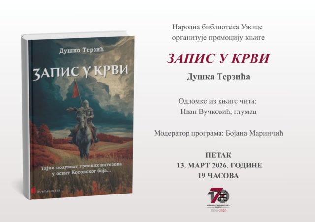 Pocetna Kultura Predstavljanje „Zapisa u krvi“ u užičkoj Biblioteci KulturaRegionUžice Predstavljanje „Zapisa u krvi“ u užičkoj Biblioteci 11. mart 2026. 48 0 Podelite Facebook Twitter 🔊 Čitaj mi Knjiga „Zapis u krvi“, autora Duška Terzića, biće predstavljena u petak, 13. marta, u 19 časova u Čitalištu Narodne biblioteke Užice. O knjizi, uz autora, govoriće i glumac Ivan Vučković i bibliotekarka užičke Biblioteke, Bojana Marinčić.