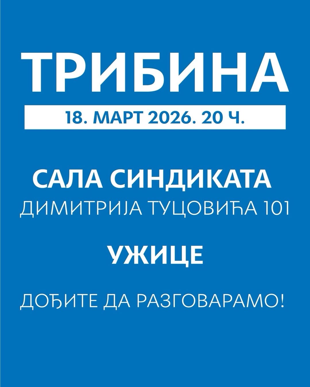 U Užicu je za sredu, 18. mart, najavljena tribina u sali sindikata pod nazivom „Dođite da razgovaramo o budućnosti Srbije“.