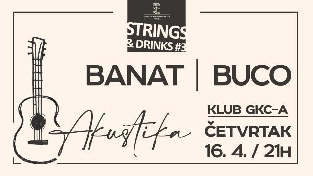Treće veče programa Strings & Drinks biće održano u četvrtak, 16. aprila, u klubu Gradskog kulturnog centra, gde će nastupiti akustični duet Banata i Buca. Posetioci će imati priliku da uživaju u pažljivo odabranom domaćem i stranom muzičkom repertoaru, uz prijatnu atmosferu i kvalitetnu svirku.