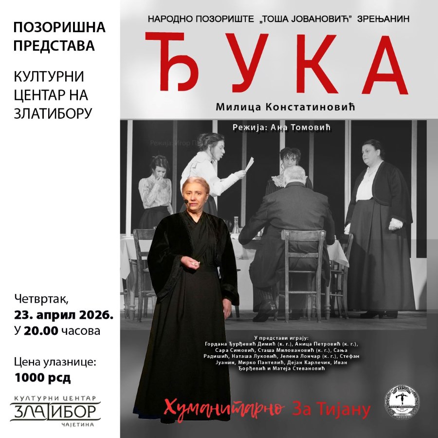 U četvrtak, 23. aprila, u 20 časova biće igrana predstava „Đuka“ u KC „Zlatibor“, drama o majci Nikole Tesle u izvođenju Narodnog pozorišta iz Zrenjanina. U glavnoj ulozi nastupa Gordana Đurđević Dimić, dobitnica Dobričinog prstena za 2025. godinu. Režiju potpisuje Ana Tomović.