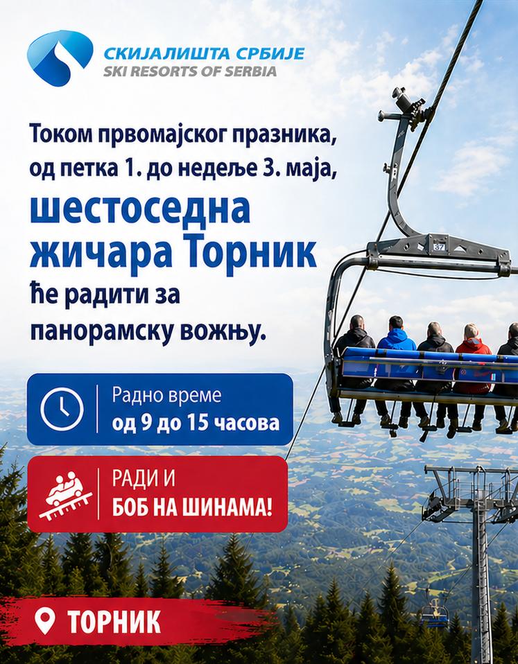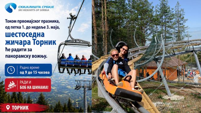 Od petka 1. do nedelje 3. maja, svi posetioci ski centra Tornik moći će da uživaju u panoramskoj vožnji šestosednom žičarom Tornik, kao i u adrenalinskom ugođaju na bobu na šinama.