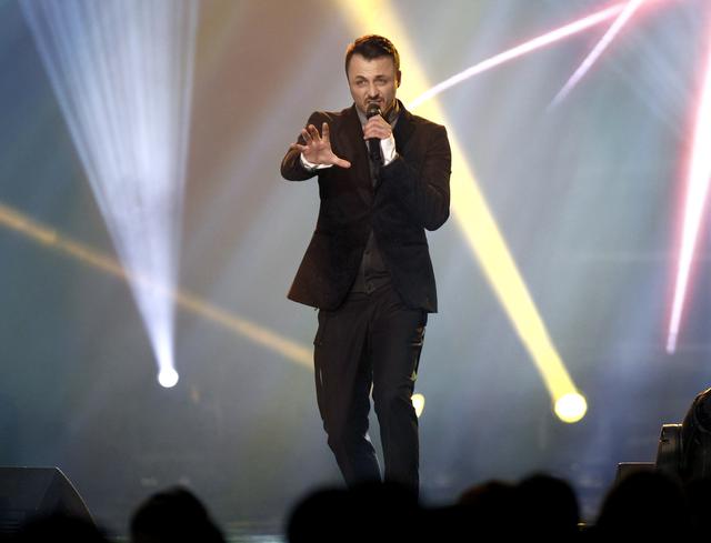Daniel Kajmakoski performs the winning song on Skopje Festival late Wednesday, Nov. 12, 2014. Kjmakoski, with his song Autumn Leaves, will represent Macedonia on 2015 Eurovision Song Contest in Vienna, Austria. (AP Photo/Boris Grdanoski)