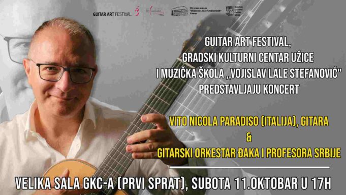 Guitar Art Festival, Gradski kulturni centar i Muzička škola „Vojislav Lale Stefanović“ organizovaće koncert italijanskog gitariste Vita Nicole Paradisa i Gitarskog orkestra đaka i profesora Srbije. Koncert je na programu u subotu, 11. oktobra, od 17 časova u Velikoj...